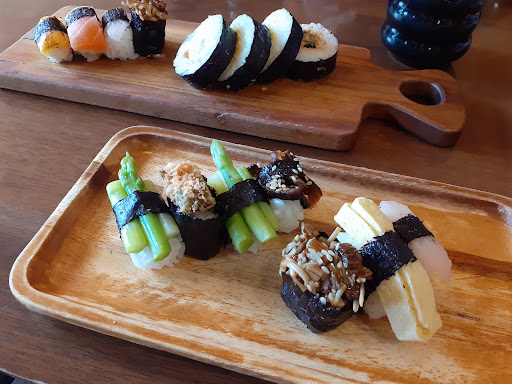 料理豐富,沙拉定食、冷沾麵套餐、壽司套餐、壽司盛合、風味湯麵、乾拌麵、特色小皿等。握壽司、捲壽司跟軍艦壽司,菜單標註清楚;上菜之後,每個手作壽司都好吃,金滑菇、櫻花蘿蔔等,尤其醋飯的部分,非常喜歡,但體積較迷你,大約兩個指節,剛好一口的份量,還有超多口味沒有吃到的樣子,只點了一個梅盛合壽司,確實不夠過癮啊。