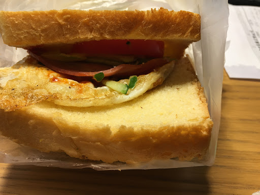 就韭菜蛋餅來說,餅皮包裹的內容物,應該是跟韭菜盒的內容物相同,有韭菜、粉絲、豆乾蝦皮等等。這我在外面還真的沒吃過這樣的蛋餅,也算得上嘗試到了店家的手路蛋餅。 就火腿蛋吐司來說,份量沒話說,但個人覺得欠缺了一些細緻度,首先麵包體的柔軟度不夠,所以就會影響到口感,厚厚番茄片如果能以切薄片多片來替代,口感應該會更好。