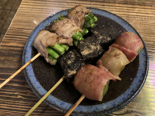 我們坐下之後,服務生親切地向我們推薦了明太子雞腿排和午仔魚一夜干,他說他們的一夜干是自己曬的,而明太子醬每間店的做法都不一樣,常去居酒屋遊走的我,發現果真味道真的不一樣,很好吃欸,魚肉細緻軟嫩,雞腿排烤的剛剛好搭配明太子醬,真的不枉費來一次,其他的串燒類最推薦厚切牛和牛橫膈,兩個部位在味道、口感上是兩個極端的產品,還有蒜香豬五花和伊比利肩胛,正所謂吃肉不吃蒜,香味少一半,五花肉配蒜的味道,真的絕了,而伊比利更是豬肉裡面能吃不用全熟的肉塊,七分熟的伊比利豬,肉的軟嫩和些微油脂的加入,凸顯肉的質感,帶一點筋可以咀嚼更久,讓伊比利的味道更香,主食的部分點了牛丼和明太子白醬烏龍麵,烏龍麵的奶香濃郁,剩下的白醬搭配其他串燒一起吃又是另一種不一樣的口味,感覺像發現了新大陸。