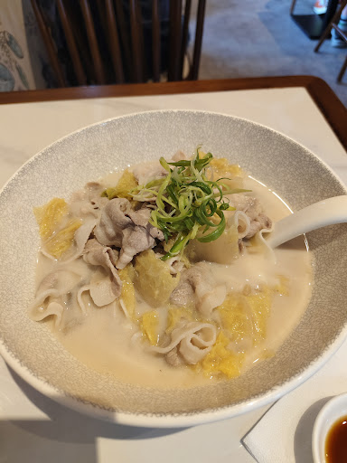 This place is down the street from my house. I'm glad I arrived early as they got busy very quickly and you will have to wait. The noodle bowl I ordered was big enough for 2 people,meaning it was too big for me to eat such a large amount of noodles. With that being said, that was my first time eating those kind of noodles and they were delicious. They were long, silky and had a slight hint of salt. Which is nice as most noodles here are very bland. And this place knows that a bit of salt equals flavor. The broth was delicious and the pork had a nice bit of fat on it. All delicious. Sorry I didn't finish the tea as the flavor I chose gave me a headache immediately. Not the restaurant's fault. Overall,great lunch. I'll come back with someone who can help me eat all...