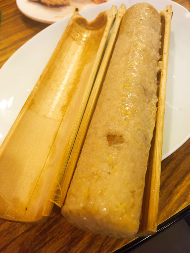 接著品嚐了 小米竹筒飯,糯米口感Q彈,吸收了竹筒的清香,單吃就很有風味,搭配烤肉或其他料理更添美味。再來是一道 馬告香腸,這是原住民特色香腸,裡面加入了馬告(山胡椒),帶有獨特的辛香氣息,與一般香腸相比更有層次感,吃起來鹹香又帶點微微的麻香,讓人印象深刻。