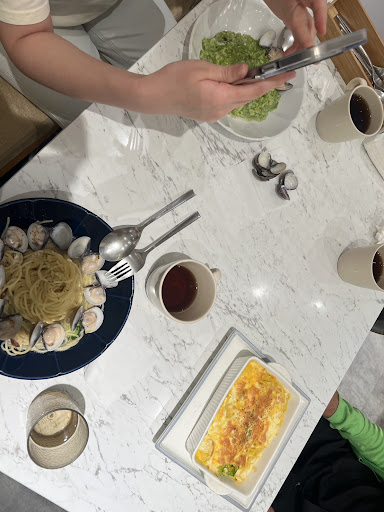 店面風格走明亮色系 白色油漆搭配大理石紋的牆面 桌面也是大理石紋路 整體風格有別於一般義大利麵店的溫暖黃光 走出自己的特色 蠻有記憶點的 店內座位不少 桌距適中 美中不足的是某些座位的桌子太小 寬度大約男生肩膀寬度再小一點 加上桌子擺上餐具盒還有面紙 其實桌面對於用餐的人來說略為憋