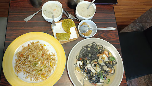 以下為此次點餐的品項及價格🔻 🔺玉米巧達濃湯 $45 口味跟牛排店可無限裝取的味道差不多 🔺辣味蒜酒海鮮墨魚麵 $260 真的有辣🌶️墨魚麵體Q彈 🔺蒜片白酒蛤蜊寬麵 $200 白酒味道幾乎沒有,蛤蜊大小正常有2顆沒開,寬麵口感還不錯 🔺青醬海鮮管麵 $250 青醬味道有但就是沒有像義式那麼的濃郁,海鮮的部分有魚肉、透抽、蝦、蛤蜊 🔺乳酪茄醬鮮蝦義大利麵 $220 乳酪很多跟紅醬還蠻搭的,蝦子好像是3隻而已偏少大小也偏小,但蝦肉還算紮實 🔺鮭魚炒飯 $190👍🏼 應該改主推炒飯(?)調味適中米飯粒粒分明,鮭魚非常細小但配料還算多元 🔺香蒜麵包...