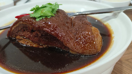 Read more觀望許久,在喧鬧雜亂的街道上有著這麼間低調,不起眼但格調卻與眾不同的店家! 與家人小聚訂桌,商家告知廚房師傅有人請假,餐點出餐會慢性!早食的我們也有著心裡準備!不過說實在的還真有些慢,但開放式廚房可以看到師傅認真做菜的模樣,卻也讓人願意耐心期待。果然!慢工出細活,餐點口活,刀工還真的都讓人回味不虛此行! 東坡肉,肉質Q彈滑嫩,肥不隆冬的豚肉,滑而不膩,讓人一個不小心可能咕溜就滑入喉間!刈包夾伴著肥瘦參半的豬豚肉,彷如大水澆熄了烈火,讓人感覺不到油脂肥膩,毫無負擔的吞入腹中! 厚煎烏魚子松露蛋,單聽菜名讓人有著好奇感!烏魚子怎麼搭配烘蛋,又怎麼跟松露做朋友!待上桌後,彷若是一道藝術作品!蛋嫩蓬鬆像一輪明月伴著烏雲飄過!彭鬆爽口,可以吃到烏魚子的香,又點綴著魚子醬微甜!喔特別! 還有那找不到臭豆腐!是真的有臭,妹婿直皺眉頭;絞肉拌炒臭豆腐碎末,有點像肉糊,拌著白飯入口!著實讓人忘了要減肥,一口接著一口!這有點罪惡!又有著難捨!有著愛恨情仇的交織! 辣炒水煮牛,那乾辣椒真的辣的我稀疏頭皮髮根出汗了!牛肉紮實不老,湯汁拌飯也會讓人意猶未盡!老妹還把湯汁打包打算回家加工一番! 其他菜餚也在水準之上,只是才疏學淺焦頭爛額的想不出華麗的辭賦讚美!那就好吃;好吃的!還是好吃的! 總之!今天上菜速度是慢了些!但師傅員工服務的態度卻讓人感到很真誠!每道佳餚都有著台菜西式擺盤做法!可以感覺到師傅的用心...