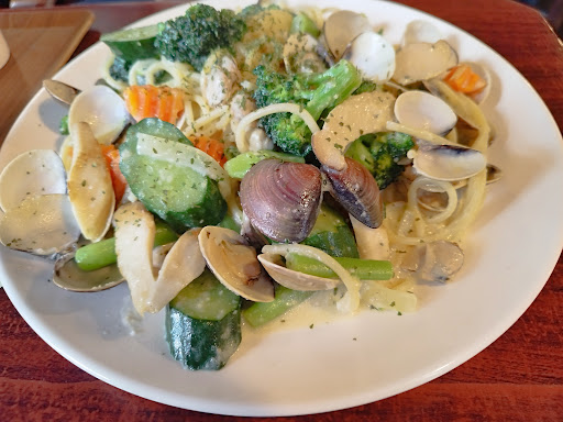 餐點的部分,辣奶油蛤蜊義大利麵裡的配菜非常的多,有小黃瓜、胡蘿蔔塊、四季豆、洋蔥、花椰菜、杏鮑菇…等,還有一大把蛤蜊!!吃得到蔬菜的原味,醬汁不會太重,辣度竟有10度可以做很細微的調整,還有很多香料佐味,完全啊沙力的一大盤麵,重點是還很好吃,麵的硬度呈現的很剛好!!👍👍這樣一盤才200塊,還附飲料可以選,還有冰淇淋跟優格二選一,男生也可以吃的很飽。