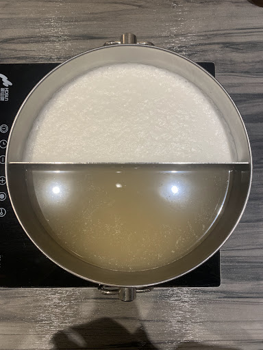 湯底我們選擇藥膳及剝皮辣椒, 皆要額外加價$59, 湯底沒什麼料, 但味道滿不錯的, 菜盤有四種選擇, 我們的綜合是有火鍋料及葉菜類, 火鍋料好像餃類丸類每盤不固定口味, 下次會想單純菜類就好, 菜都滿新鮮完整的。