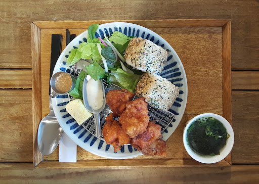 定食的部分,主要有兩顆外表灑上香鬆的日式飯糰以及生菜沙拉、小塊的玉子燒、和三塊唐揚雞和湯品所組成,內容物比我想像的還要少,感覺這比較像是輕食。飯糰的部分本身除了香鬆粉以外沒有其他額外調味,米飯是蠻好吃的卻少了一點味道,後來我媽是把飯糰倒入裝有芥茉風物的沙拉碗內拌勻,整體風味才更提升,至於唐揚雞個人覺得普通,肉質稍微乾柴了一點。冰拿鐵還不錯喝,整體偏苦了一點,但還可以接受,份量也很剛好。