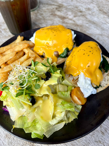 Read moreI came here on a Sunday afternoon and got the eggs benedict. It comes with salad and sausage, but since I don’t eat meat, I got french fries instead of the sausage. The food was AMAZING! And the staff members are extremely friendly. They have an English menu, and the workers speak excellent English. I sat outside so I could talk on the phone, and a staff member came out and made sure I wasn’t too hot. I can’t speak more highly of the staff. I will definitely be coming back...