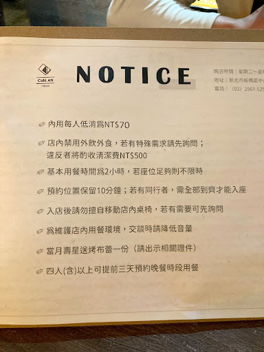 Read more板橋早已是早午餐、下午茶、甜點店的超強戰區,在朋友的推薦下特地光臨巷弄間這間溫馨舒服的咖啡店,外頭是襯著大片玻璃窗落下的自然光並搭襯著一台腳踏車,一推開門,裡頭到處都有綠葉的點綴,真的是還沒用餐就讓人感覺舒服又雅致,重點是沒有限制時間,這種舒適氛圍真的是待上一下午都不是問題;而在實際體驗後的感覺還挺不錯的,今天主要和男朋友來小約會,就沒點主餐,主要點了檸檬塔、香草拿鐵、紅茶,而這些都兼顧到外觀和味道,是療癒效果十足的好店。 一開始拿到菜單時,很驚艷!排版、色彩、質感都獲取我的好感,一家咖啡店如果沒有舒適的座位與環境,就算飲品餐點再好吃也是枉然,因為心情就沒辦法真的放鬆。安咖啡提供的情人雅座沙發(自己取名^_^)非常好坐,寬度、高度夠,我相信各種體型的人都會喜歡; 第一道檸檬塔第一口就讓我立馬決定臨走前我要再外帶一片走!真的好對我的味!還忍不住問老闆娘怎麼做,老闆娘是為可愛的女孩兒,才知道每天晚上是多辛苦的在用心與堅持手作的品質,或許外觀非常的普通,但味道真的可以吃的出一點也不含糊的味道,不會酸到變臉,還滿嘴的檸檬香,讓我一整天滿足啊~接著我的香草拿鐵來了,香草🌿香淡雅,配甜點吃剛好,不會因為檸檬塔的味道壓過咖啡,讓我有訝異的是香草拿鐵好溫和,不會像有些連鎖店的太香甜到很化學,我的這杯咖啡完美的不會壓到甜點風采,我男友則是點了沁涼無比的紅茶,整體比例調配的剛剛好,不澀不甜膩淡淡的茶韻好順口呀!也是獲得好評五顆星;吃甜點喝咖啡時,常常為的是獲得一種療癒,不只是針對舌頭,更是為了讓壓抑的心情能獲得釋放;這天的安咖啡嚐鮮,確實讓我獲得了想要的放...