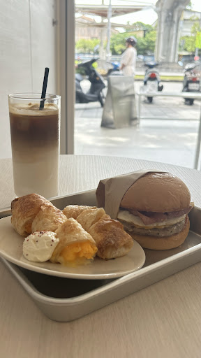 Read more✨必須5顆星!! |餐點|C套餐$285(小貴但超級飽) 🍔培根蛋堡 很香很好吃,很濕潤不會乾,裡面的醬是整個漢堡的靈魂,不是說多厲害,就是增加了一層風味。 漢堡是有奶油煎or烤過的,邊邊角角是脆的(喜歡!)整體來說很滿意~ 🍔咖啡拿鐵(少冰) 用看的感覺牛奶很多,但其實比例我覺得很剛好,有咖啡香也有奶味。 🍔起司蛋捲 覺得最特別的品項!裡面不是只有起司跟蛋,下面還有一層好像是馬鈴薯泥(很酷,很搭)。原本看到想說天啊⋯有醬油膏嗎⋯(我是超級醬王!)但後來想說先吃吃看原味好了,沒想到很好吃耶!吃到後面才發現旁邊很像奶油的東西原來是類似酸奶的醬(嗎),我以為只是一般的奶油,差點就略過了,搭配蛋捲很讚! 🍔盤子 吃完吃後發現居然是蛋的形狀耶!超可愛的!
