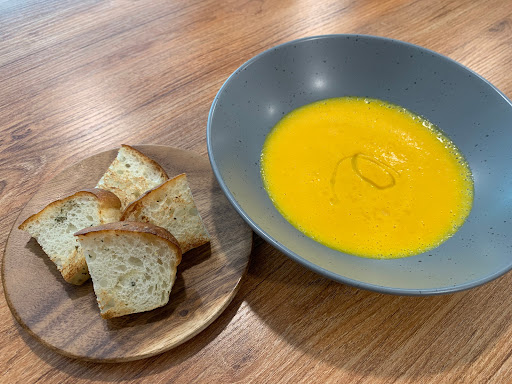 #每日例湯 湯品揭開了序,今日湯品為南瓜濃湯,不加任何一滴水,滿滿南瓜精華鎖在裡面,配上表面唯脆,內在綿密的餐包,正好起了解膩的作用,開始給胃做了暖場,更期待接下來的菜品。