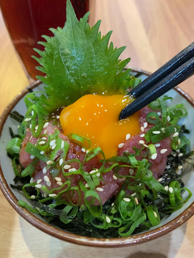 月見蔥花鮪魚泥丼,刺破蛋黃讓蛋液包裹在綿密的鮪魚泥再搭配白飯,入口滑順沒有腥味,尾韻還帶著青蔥和海苔的香氣,讓人一口接著一口停不下來,對於敢吃生食的人來說是滿推薦的