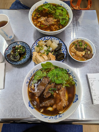 Read more這次來用餐都是點紅燒湯頭,麵條有寬、細二種可選,我點紅燒半筋半肉的寬麵,先省點牛雜紅燒細麵。 雖說都是紅燒,但二碗湯喝起來的味道卻有些微差異,我那碗喝起來就一般認知紅燒的味道,先省那碗喝起來比較像加了蕃茄一起燉的湯頭,就有點蕃茄的酸香味。 內用的話有豆漿、紅茶喝到飽,醬料台上的佐料、醬汁也都能自行取用,本來對無限暢飲的飲料都不抱希望,沒想到這家的豆漿跟紅茶還不錯喝,不是一等一的味道,但以要提供給客人暢飲的等級來說算是好喝了,而且喝起來也不會太甜,讚的! 額外加了一些蔥、蒜泥、花椒油到湯裡面,多了花椒的麻香味跟蒜泥、蔥花的加味,感覺湯頭更升級。 麵條的話,我個人較喜歡寬麵的口感,他們的寬麵吃起來有嚼勁但又不是偏硬的那種,吸了肉湯的味道變得更好吃。 細麵就覺得沒什麼特色呢,就是細麵.....