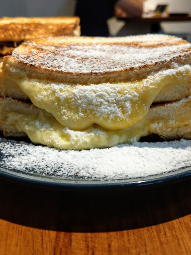 Read more板橋江子翠的人氣早午餐店,原本座位較小,去年搬至現址,好的是座位較多且桌距寬,相當舒適,但門外都是紅線,連停機車都要找一下才有位置。 因為生意好且餐點現點現做,所以需要等比較久,可以先預約到店取餐,直接來店外帶店家內外都有準備等候椅。 假日早上內用外帶的人潮不斷,超過09:00內用就需要排隊或併桌,此時就覺得座位有點少,應該可以再排張桌子。 內用入內就跟店員說,店員會拿菜單和安排座位,決定菜色後不需要劃單,直接去櫃檯點。 菜單有分清爽吐司和熱煎吐司,清爽吐司是白吐司,多半會加美生菜,而熱煎吐司全部都是加兩種起司一起去煎,另外點吐司+飲料還會有折扣。 點完餐後餐具、水都要自取,檯面上還有玻璃吸管,另外還有包包籃或是防疫隔板可以自己拿。 店家雖然有告示尖峰時段餐點會需要等,但餐點真的等超久,連飲料都遲遲沒上,飲料上桌時看了時間,足足等了25分鐘,吐司上桌時剛好等30分鐘。 冰的鮮奶茶店員推薦半糖少冰,喝起來有蜂蜜香,味道還不錯。 這裡的吐司較一般方型吐司長1/3,份量較多,且吐司有鮮奶的甜味,熱煎吐司裡的瑪滋瑞拉起司有牽絲的效果,而切達起司是負責香濃的效果。 費城起司牛肉的吐司烤的很酥,起司融化的程度很好,一口咬下口感豐富濃郁,內餡味道吃起來像是Costco的牛肉卷,但牛肉和洋蔥太大條不好入口,且牛肉應該是用牛胸肉,可以吃到細細的筋。 雙起司戀乳外面有撒白糖粉,但煉乳味較淡,被起司味道蓋過去,只呈現微微的甜味。 店內客滿時溫度偏高,看了一下只有一台分離式冷氣,雖然有裝兩檯循環扇,但投射燈的熱度太高一直照,坐一下就熱了。 最讚賞的是這裡雖然是家庭式經營,但兩位女店員的服務超級好,應對態度很客氣,離開時一定看著你說拜拜,這個非常加分,原本餐點等太久和餐點口味稍有扣分,但服務完全補上...