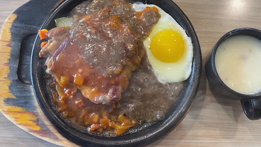 Read more一進來,服務生就很客氣的招待我們,並介紹餐點,由於進來的時間有點晚,所以就趕緊先點餐,我們點了一客戰斧豬排和一客勁燒雞腿排,等餐時間,就先去生菜沙拉吧自助取前菜,這裡的生菜沙拉吧很豐富,我個人覺得比我年初去的寒舍艾美探索廚房的生菜沙拉還要好吃,這裡的萵苣菜清脆爽口且菜葉新鮮,配上甜椒、玉米丶小黃瓜、玉米筍和苜蓿芽,灑點葡萄乾和花生粉,再淋上沙拉醬汁,就可以先享用美味的前菜,我們也拿了台式的玉米濃湯,嚐了一口,勾芡味太重,不是很喜歡,主菜上桌時,肉排和蛋在熱鐵板上發出滋滋滋的聲音,並冒著白煙,這真的是一種別樣美味食物的享受,是在西式牛排無法體會到的,戰斧豬排真的很美味,搭配黑胡椒醬,不但肉排外脆內嫩有嚼勁,並帶有油脂的香氣,比松阪豬還好吃,至於雞腿排,也是外脆內嫩,但是似乎少了一種肉的香味,中規中矩,還可以,我覺得這裡的拿鐵也很不錯,不輸星巴克,令人感到意外,其他的小菜甜點,由於用餐時間太短,...