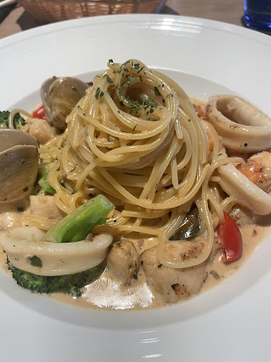 燻鮭魚奶油義大利麵也是一大亮點。奶油醬汁濃郁卻不過於油膩,燻鮭魚的香氣與義大利麵的口感相得益彰,每一口都能感受到食材的用心。手工墨汁海鮮燉飯則是另一道驚喜,墨汁的鮮美與海鮮的搭配使得這道菜色香味俱全。