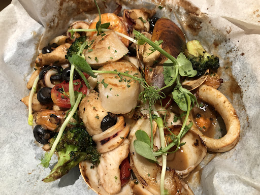 地中海風紙包海鮮的呈現方式別具一格,海鮮的鮮甜味道被紙包鎖住,每次打開紙包都能聞到撲鼻的香氣。酥炸透抽的口感酥脆,透抽新鮮,配上特製的沾醬,讓人一吃就停不下來。