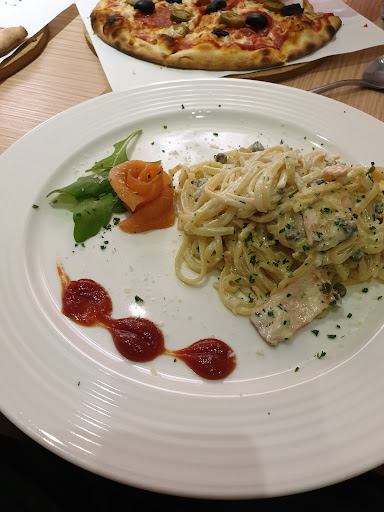 The pizza wasn't great, but not bad. We ordered three pasta dishes and all were lacking in portion sizes. The worst was the Salmon with Vodka Cream Sauce. They decided to garnish their dish with Ketchup. I don't know of any self respecting Italian that would ever serve a cream sauce pasta with Ketchup. It's also unfortunate that the only service we received was taking our order and bringing food to the table. We had to ask for water, a service charge implies service....
