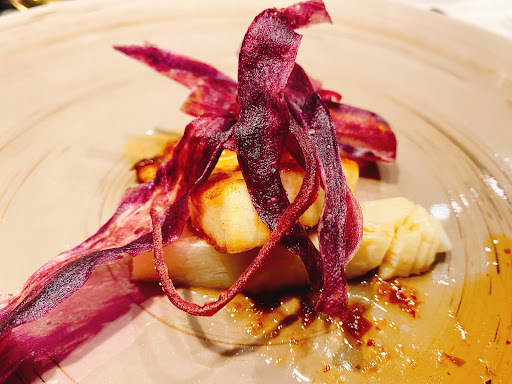 海陸餐的乾煎生蠔,搭配了主廚說用西米露做成的薄餅,我覺得後者確實蠻特別的,第一次見到,但味道上沒有幫乾煎生蠔加到分,雖然生蠔本身味道就很好,但兩個東西一個常見但味道好,一個罕見但味道普通,並沒有互相加乘產生1+1大於2的效果,稍微可惜了一點。這個西米露薄餅挪去甜點當可食用的盛裝器皿,搞不好還更有發揮空間