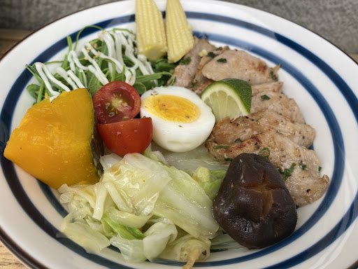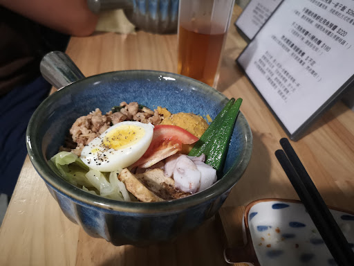 丼飯組成多元,意外的是每個元素都到位。蛋,雖不是主流追求的溏心,不過蛋黃還是挺水潤的;高麗菜,口感對我而言是喜歡的,介於軟跟脆之間,有用薑和麻油炒過,帶一點點迷人的香味;南瓜泥,甜度、色澤都自然,完全的綿沒有吃到一丁點硬;香菇,醬燒入味,不會過鹹過甜且水份飽滿;龍鬚菜,菜的生味已經被拿掉,但老實說自己沒有很喜歡美乃滋,以更單純的鹽或醬油膏調味個人會覺得更不違和,另外還有玉米筍和番茄,中規中矩。