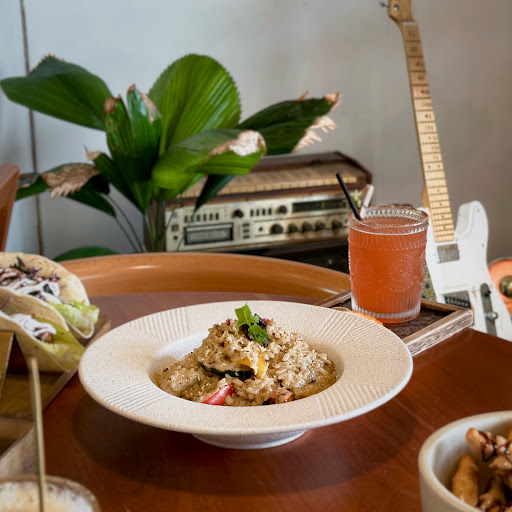 日式歷史建築 外頭還有小庭院 入內需要拖鞋 舒服的踩上木地板 還可聽見正在播放輕快的音樂 同時看見店內充滿童趣的裝飾 插畫 貝斯 收音機⋯