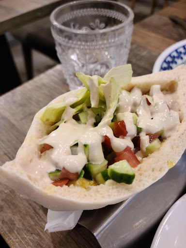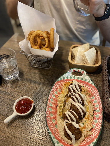 Read moreThe overall experience was good, the falafels are delicious, the hummus is a bit too lemony to my taste but I liked the texture and the nice chickpea feeling. However the pita was served cold instead of toasted. Even though it’s their way to do, the service staff doesn’t even ask our preference. The onion rings were good, nothing exceptional, and serve plain unseasoned and only with ketchup on the side.