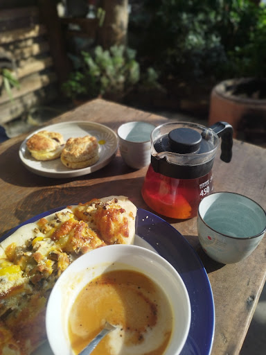 沙拉食材新鮮,鷹嘴豆泥超美味,湯品香濃好喝(老闆還很認真的拿湯品的原料給我看)。 外帶的司康也很好吃😋!