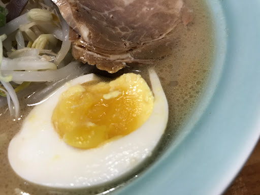 I ordered the miso tonkotsu ramen, which seems to be their flagship: it's the first full-page photo in the menu, $230 NT. It comes with a large thin slice of trash you, 1/2 soft boiled egg, and various bean sprouts and other garnishes.