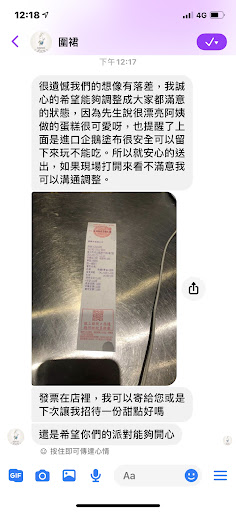 最後,請各位在訂蛋糕前先三思。今天店家要求我11:30準時取貨,我請先生跟小孩提前過去,11:27先生打來說店家沒開,我告知先生店家說因為今天公休,等她一下11:35會到。結果11:37我傳給店家訊息說先生在外面,她說再等一下下。直到11:42先生才傳訊息說店家終於接電話了。而店家打電話在討論補償事宜時竟然敢大剌剌說她早就在店裡面。