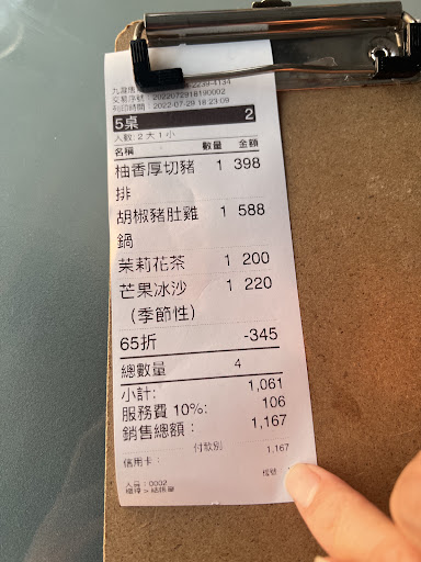 先從服務說起,光是飲料杯就有塑膠和玻璃杯兩種,看得出器材準備不足。加點白飯時,前後兩次竟然出現兩種不一樣的碗裝著不一樣的飯量⋯難道拿到小碗的是盤子嗎?然後我們想要跟服務生索取冰塊加飲料,服務生彷彿愣著,然後說她要找一下。滿頭問號之餘,最後我們到用餐結束也沒有拿到冰塊,而我離場時卻看到別桌客人有一整桶冰塊放在桌上。外場服務生有不少外籍員工,導致我們跟他們提出需求,他們也是有聽沒有懂。