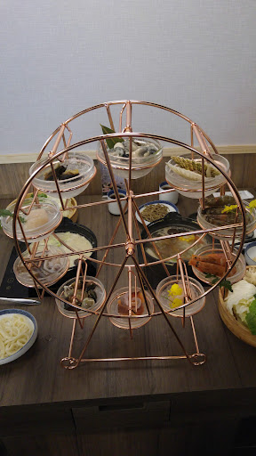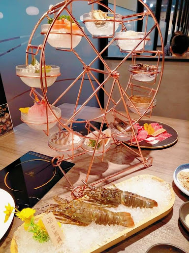 為了吃🎡「摩天輪」🎡而來,門口有停車場非常方便,省去找車位時間,店內空間雖不大,整體和風氛圍乾淨舒適,餐點CP💯,另外不得不好好讚美一下洗手間👏👏👏,是最用心貼心的店家,有提供漱口水、女性生理用品,乾淨明亮無異味。 🎡🎡【摩天輪海陸套餐】摩天輪比預期尺寸大很多,主食有一大盤豚肉,油花分佈肥瘦剛好,海鮮食材一碗一碗乘坐摩天輪上,想煮哪一個海鮮,轉動摩天輪夾取真方便👍,另外再加點小龍蝦,肉質Q彈新鮮,海陸升級UP。 鍋底店員推薦「阿爾巴松露牛奶」,上鍋後店員專業戴上手套,松露真材實料超霸氣!直接現刨松露片給你看,外面很多餐廳主打松露餐點,都看不到松露在哪裡?這一點加分不少👍👍👍,牛奶湯底加入松露,湯頭帶有微微松露香氣,牛奶湯底不是濃郁型的,越煮松露味道越喝越好喝不膩! 附餐主食:「日曬蕎麥麵」麵條很Q,沾胡麻醬味道超好吃。 飲料:「草莓可爾必斯」草莓雖然是冷凍草莓,但吃得完整整顆草莓,一杯裡約有5~6顆好滿足,甜度稍微甜了一點,如能調整糖度才不喝到最後有些膩。 最後甜點:「手作茶點」日式櫻花凍,吃得到櫻花花瓣,淡淡櫻花香分佈在嘴裡,味道清爽不甜膩,讓人少女心大爆發,已經吃得很飽,還是留吃甜點的胃😄😄😄。