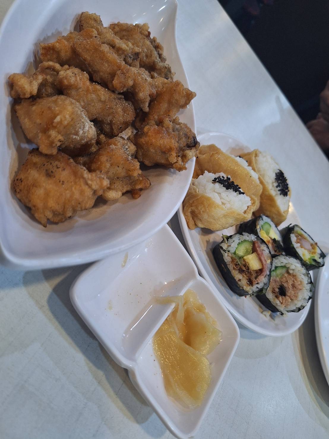 Read more餐點非常一般,我個人覺得實在沒有推薦的必要,唯一的優點就是價格實惠,點蒸蛋~嫩卻乾乾的,沒什麼味道,豆皮壽司~豆皮味道不到位,壽司飯略硬,酸度不夠,綜合壽司~每一個的大小不一致就算了,口味除了肉鬆之外,一律都不突出,吃在嘴裡每一個的味道都差不多一樣,吃不出有不一樣的口味,其中最踩雷的是~唐揚炸雞~我的天呀!根本只是一般台式的帶骨胡椒炸雞,夾了第一塊炸雞帶著期待的心情咬下去,真是無言了,不管換哪個角度咬,除了滿滿的「骨」感,實在吃不太到什麼肉,就像是在吃炸雞排,吃到後面在一堆骨頭裡盡量啃出肉的感覺,還不如買塊雞排來吃還比較過癮,店家對日式唐揚雞是又怎樣的誤會呀!打著日式賣台式,象徵台日友好關係嗎?以上純屬個人觀點,青菜蘿蔔各有所愛!沒有惡意,請勿論戰!