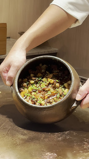 第九道是炊飯 炊飯裡有些許牛肉邊角料 以及很多很大顆的大蒜 到底為什麼要在炊飯裡面放這麼多大蒜我實在吃不懂 而且大蒜的味道吃起來有一股怪味 感覺放很久