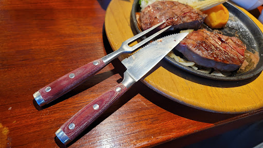 開在高速公路上,小朋友突然說餓了,索性就在大甲交流道下來開始覓食,開啟地圖搜尋,本來是要去簡單吃,但導航過去都不太好停車,決定先停車,然後打開地圖,找到最近的餐廳,就是這家,第一眼因為厚重不透視的大門,讓人有種神秘感,神秘感等於未知數,帶著忐忑不安的心情,往樓上爬,還好店內不少客人,這才放心,入座後送一本,書本造型的餐具盒,入座後稍加講解用餐方式,開始今天的體驗,本次點了12oz沙朗牛排、雞排、兒童餐,每人有抵消130,牛排7分熟,比較厚,中間還是會有些血的感覺,不會流出,可以看出層次感,但這才是我覺得合格的牛排店,醬汁相對普通,吃原味比較讚,雞排煎的不錯,但因為醬汁普通,所以比較沒味道,也建議可以加些鹽巴,豪邁的兒童餐,有餐包、蜜汁地瓜、薯條、雞塊、蔬菜飯,沒錯來到這裡最特別就這坨飯,每套排餐都有附,鋪在鐵板上煎帶一點焦味,吃起來更香,薯條及餐包可以續,有水果、飲料、湯品也是自助式可以續,餐具讓人印象深刻,讓人吃起來感覺很豪邁,份量非常充足,我們還剩了許多餐包,但餐包太紮實了,比較像饅頭,整體非常滿意,小朋友也非常愛,番茄醬也有巧思畫了一朵花,一桌一盤,有吃美式牛排的豪邁氛圍,忘了講最重要的,肉質不錯,不會柴卻有嚼勁,這代表肉品有做好保存,喜歡牛排的各位,可以去試試看,後來發現是個連鎖品牌,很可惜台北沒有,只...