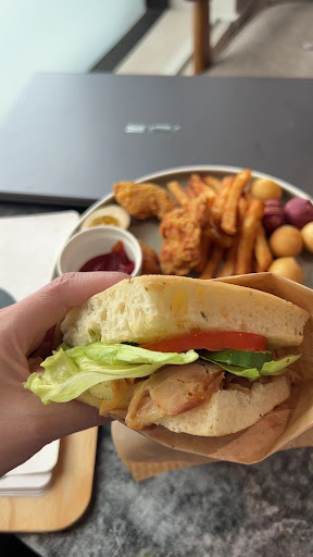 ̗̀ 剝皮辣椒燻雞貝果套餐$𝟤𝟤𝟫 附 薯條、唐揚雞、地瓜球、溏心蛋、$𝟧𝟢茶飲 𓎩𓌉𓇋 ●●●●○ 剝皮辣椒的風味做成燻雞! 煙燻跟辣味的結合讓香氣更有層次 貝果的麵包本體本身就不乾 融合了剝皮辣椒醬汁的濕潤 整體不單調 一口就讓我驚艷 附餐的炸物也都有一定的水準在 唐揚雞炸到酥脆 肉質不柴 薯條外酥內軟 是我喜歡的口感 雙色地瓜球的內餡還有地瓜泥、紫薯泥 還沒吃完整盤我真的就飽了:)