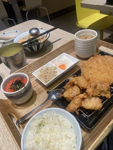 黃金豬排辛奇部隊鍋$368 除了沒味噌湯之外附餐跟其他套餐一樣,都有白飯、醃漬小菜、茶碗蒸;部隊鍋內有放年糕、泡菜、泡麵、鑫鑫腸、起司、菇類跟花椰菜,豬排也比朋友點的更嫩些,不過如果不能接受泡湯的炸物就不推薦了🤣(我蠻喜歡的所以才點😛) 整體來說,味道就是外面隨便一間火鍋店泡菜鍋的味道👍 唐揚雞黃金豬排雙拼$369 豬排不知道是部位不同還是拍的比較扁的關係,吃起來沒那麼嫩、還有些膩口,唐揚雞小小一塊味道也只能算普通,沒有什麼亮點