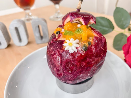 // 🥭百香芒果起司 $120 乍看只是一顆平凡的百香果,切開之後呈現漂亮的花色,香甜的起司冰涼滑順,口感跟🍦冰淇淋一樣,而且吃得到百香果肉,中間紅色的部分則是覆盆子跟紅心芭樂