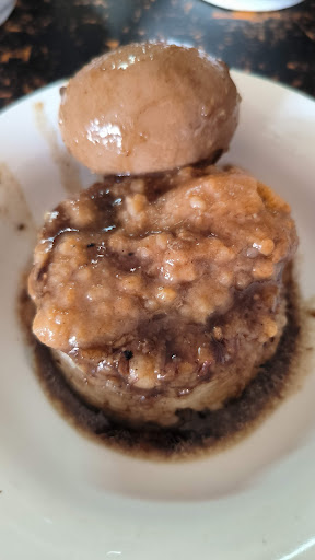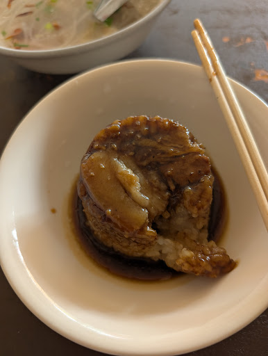 打開蒸籠裡 熱騰騰的現蒸米糕淋上醬料 吃得到Q彈入味的米糕 筒仔米糕上鋪著帶皮肉片,加分✅