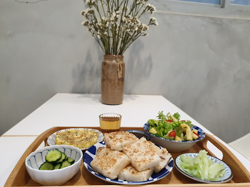 #給力蘿蔔糕 🥑五辛素💰單點80 套餐250 手工製作蘿蔔糕,吃得到蘿蔔絲,且蘿蔔香氣濃郁,還有香菇增添香氣層次,Q軟到讓我滿喜歡,我比較喜歡軟爛型蘿蔔糕大於恰恰型,蘿蔔糕就是適合跟蛋黃哥一起的夥伴,不用強求它擔任哈囉凱蒂(三麗鷗班長),明明就是台式料理卻能有日式擺盤,還能夠吃到不同配菜,有種貼心感覺,白菜滷的蒜頭味有點辣,這道配菜會讓我想起在嘉吃的小吃時光。