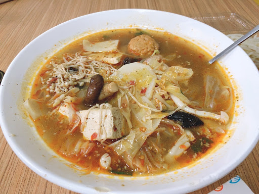 Read more這是一家讓我回台中會想再去的店!因為我還有菜單上酸辣粉沒吃到😆 第一次是一位非茹素的朋友帶我去,因為她知道我吃素,於是找了一家她覺得會好吃的店與我共進了午餐。當天我們點了紅油抄手、茴香水餃、三色乾絲、青菜豆腐湯。他們的水餃跟餛飩都是手工自製的,水餃料多皮薄,炒手也不賴,就連青菜豆腐湯都不錯。吃了炒手跟水餃後,看到其他桌都有點麻辣燙或者酸辣粉,讓我超級想嘗試看看🤩但當天實在沒多餘胃再吃。 於是,我心想有機會要帶愛吃辣的爸爸跟老爺來嚐嚐;且私訊給了愛吃辣的表妹。 第二次因和老爺到台中辦事情,於是我就跟老爺推薦來嚐嚐這家店😆 當天我們點了麻辣燙、燙青菜、素燥飯、涼拌小黃瓜。因為先前吃了紅油抄手覺得挺辣的,便跟老爺商量麻辣燙先點小辣試試,若不夠辣再加闆娘自製辣椒醬。且先前看過她們家餐點份量,所以我們點的樣式不多,就怕吃不完🙈 餐點送來時,我被素燥飯的碗給嚇到了,只知道麻辣燙是很大很大的碗公量,沒想到素燥飯也是很大碗啊!這下可又要吃太飽了🙈 滿滿料的麻辣燙,雖然只是小辣但我們二人吃的汗都飆出來了,份量十足,若老爺沒來,我一個人絕對吃不完。湯頭佳、料入味,確不失蔬菜鮮甜,讓你每口吃到美味及先辣後小麻的層次感。是一家口味特別的素食店!喜歡吃辣的朋友不妨試試看。當然我的口味,不一定是每個人喜歡的,好吃與否在於個人感受。 P.s 店內座位不多,人多時稍微擁擠。 需要路邊停車,台中市朋友最好騎機車比較方便。
