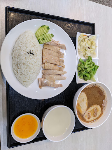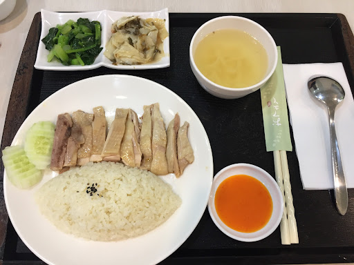 ❷海南雞飯100$:雞肉外皮Q肉質軟,沾醬微酸滿開胃,附兩小碟菜&一碗湯,食量大的人建議要再點其他小菜來填肚子。