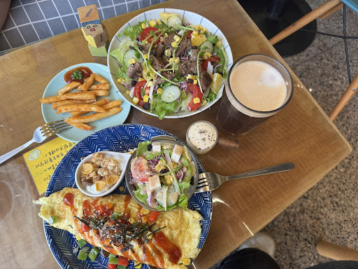 Read more先說一下餐點: 今天點了 鮪魚歐姆蛋捲(含飲料跟沙拉跟優格): 歐姆蛋捲蠻好吃👍,很嫩上面還有切小塊的甜椒搭配,多了口感、沙拉沒特色、優格有夠甜。 手打肉沙拉👎,沒看到別人寫的,手打肉原來是漢堡肉那種合成牛絞肉,還不是熱的,感覺只是煎好放上去而已、沙拉葉片很大塊,要一口塞還真難🫠 以上兩種餐點價位如此,但質感不優🥲