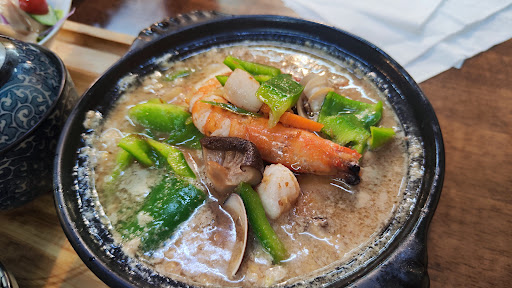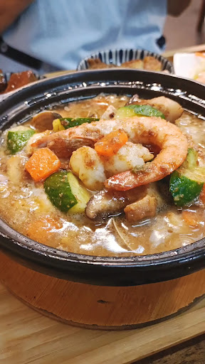 我和我老公都是點A區,我點海鮮豆腐煲,味道很鮮美,蝦子體型碩大還去了殼,免費附贈的飲料有紅茶綠茶冬瓜茶,湯是杏鮑菇加貢丸湯,我吃得很滿意。