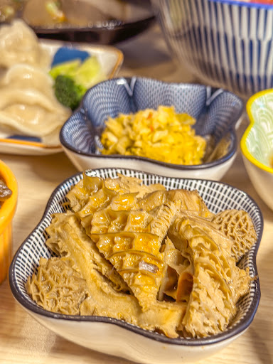📍青醬佐香菇玉米鮮肉水餃NTD.65 8顆水餃和2朵花椰菜 餡料是豬肉+玉米+香菇(少) 比較特別是有青醬沾醬可以調味 但水餃部分略顯普通