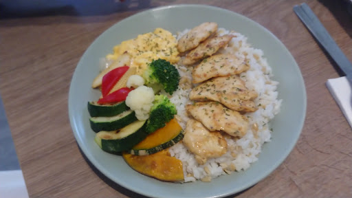 🐔 青醬香炒雞肉特選餐盤 雞肉鮮嫩入味,搭配烤櫛瓜、南瓜、美式炒蛋與胚芽飯,營養均衡又不失美味。青醬可分開放置,更貼心滿足個人口味。