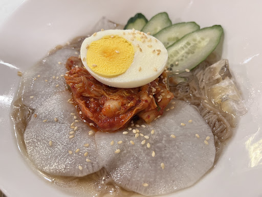 ㈡冷麵🍜(附甜辣起司德式香腸炸年糕與飲料一杯): ➊無理水冷麵$378: 整體走一個清爽路線,湯汁微酸夏天吃很爽口,麵條極細微Q,有泡菜、小黃瓜、醃蘿蔔片、泡菜與半顆蛋,建議先把泡菜拿出來,不然拌開後全是泡菜的辣鹹味,清爽感消失。加成後一碗要$416,竟然沒有一點肉😶。
