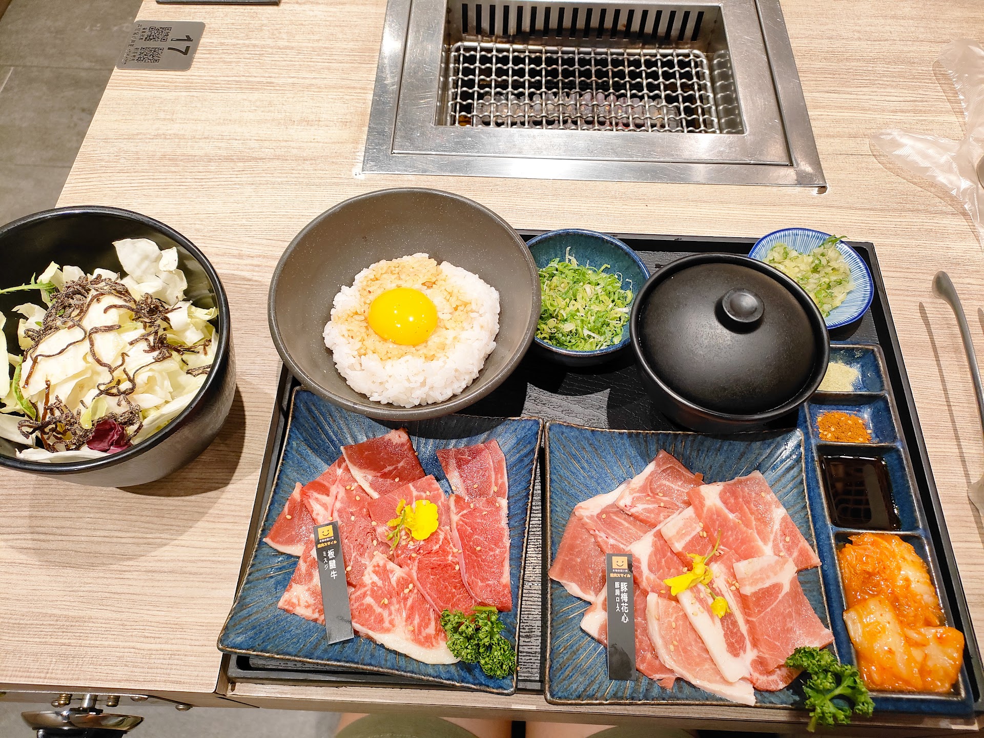 · smile盛和套餐 ɴᴛ650 肉類品質都還不錯,松阪豬彈牙、牛小排有厚度、牛橫隔膜多汁、北寄貝Q彈新鮮、鮮蝦普通好吃、黑金鑽無骨雞特有的香氣、鱈魚菲力入口即化!白飯粒粒分明與半熟蛋和蔥花是燒肉最完美的搭檔!