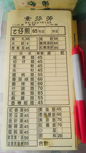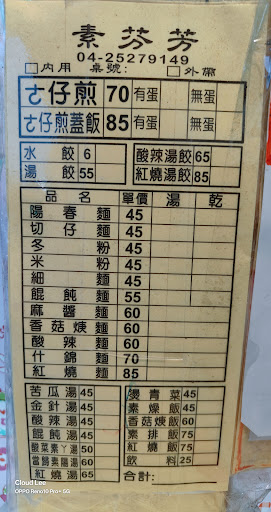 Read more今天是第一次騎綠空廊道台中往豐原段,因為吃素食的所以有特地Google一下豐原火車站附近的素食。 在博愛街上有3家,因為素食蚵仔煎較少特地選吃素芬芳。點了素燥飯、麻醬麵、水餃10顆、素蚵仔煎吃完後才結帳,收費$230,回家做帳時才發現被多收了5元(素蚵仔煎選加蛋,不知道是不是加蛋多5元,菜單沒寫)。因為當下沒有先算過費用,所以算是要再次記取教訓,結帳時最好自己先算一次,不要相信店家不會算錯。已經被n次多算錢的老實人。 PS:素燥飯、麻醬麵好吃,素蚵仔煎粉較厚吃不太習慣、水餃一般(八方雲...