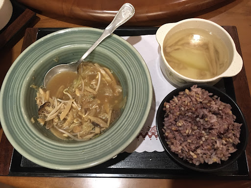 店址位在省道旁靠近日南,有小小的停車處,但其周遭的停車也不成問題 店內為中式風格,照明非常昏暗,也影響了拍照品質 一行5人點了共計1090元(不須服務費)的餐飲,整體口感ok 素鰻餐(@120)的素鰻片滿脆的;什錦炒麵(@90)及焗烤麵(@150)沒試,不知口感;紅燒湯餃(@130)餃子香甜,湯頭非常好喝;炸香菇(@70)及炸杏鮑菇(@70)與黃金豆腐(@70)也都香嫩可口 醋飲每杯(@60),點了五葉松、牛蒡、黑豆及蜂蜜,酸度很足,但量少了些,服務態度普通,免費的檸檬水放了非常...