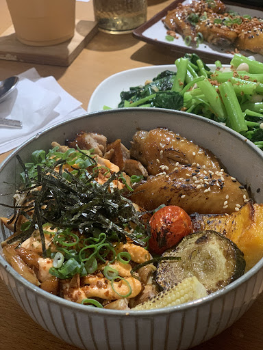 ✔️博多明太子叉燒雞肉飯NTD$200 明太子醬給的份量很有誠意! 現烤雞翅非常juicy又好ㄘㄥˋ 肉質Q彈🤤 旁邊點綴的蒸南瓜、烤櫛瓜和番茄也絲毫不馬虎 底部飯量給的非常足夠(男生食量可以吃得飽)